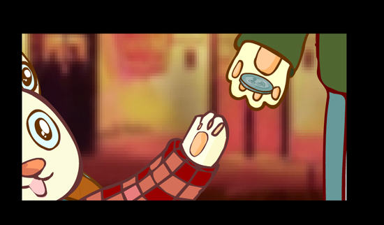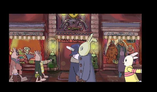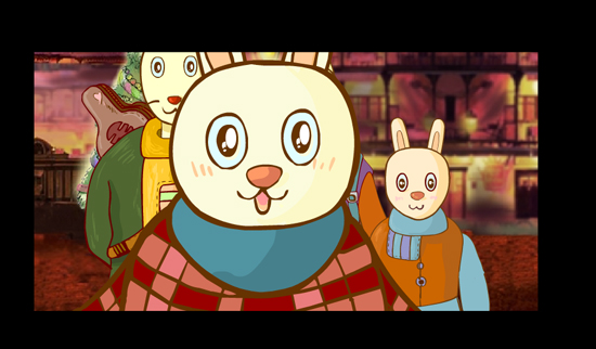 王:作品內容是這樣的:在歡樂的圣誕夜,商店里擺放著琳瑯滿目的商品,人們都在為節日忙碌著。兔子一家四口流浪在街頭,琴師用心的演奏著,小兔子則被售貨車上的一塊糖所吸引.而一塊糖對這一家人來說是奢侈的,他們用身上僅有的一枚硬幣換來了那塊糖作為圣誕的禮物.這塊糖被分為四塊,幸福在他們心中傳遞。幸福來自家人愛的分享,來自心中充滿的希望。