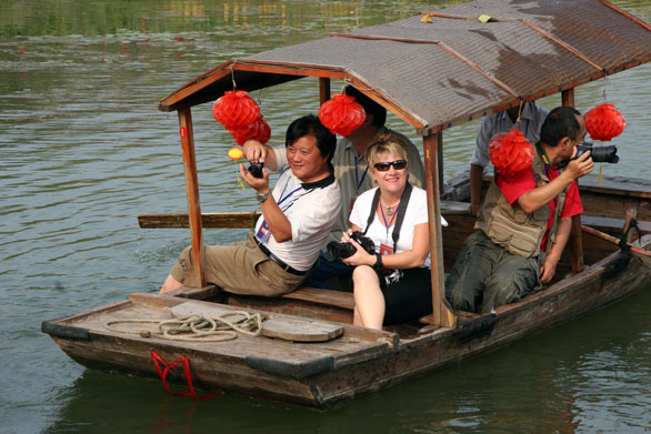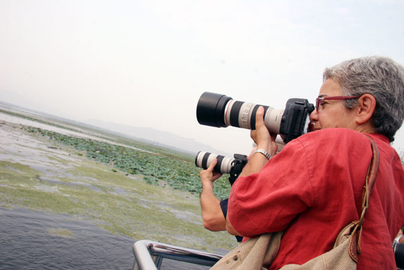 11時(shí),攝影家們又驅(qū)車趕到位于滕州西部濱湖鎮(zhèn)境內(nèi)的微山湖濕地紅荷風(fēng)景區(qū)。“西邊的太陽(yáng)快要落山了,微山湖上靜悄悄,彈起我心愛(ài)的土琵琶,唱起那動(dòng)人的歌謠?!痹趯?dǎo)游婉轉(zhuǎn)優(yōu)美的歌聲中,攝影家們坐船進(jìn)入長(zhǎng)滿蘆葦和荷葉的微山湖內(nèi),一望無(wú)際的碧綠荷葉、茂盛的蘆葦、狹長(zhǎng)的航道、悠閑自得的的船上人家、忽顯忽隱水鳥(niǎo)都成為攝影家們鏡頭爭(zhēng)相關(guān)注的焦點(diǎn)。來(lái)自美國(guó)職業(yè)家協(xié)會(huì)的蘇珊興奮的說(shuō):“這里實(shí)在太美、太有趣了,我真想把所有東西都拍攝下來(lái)帶回去。”