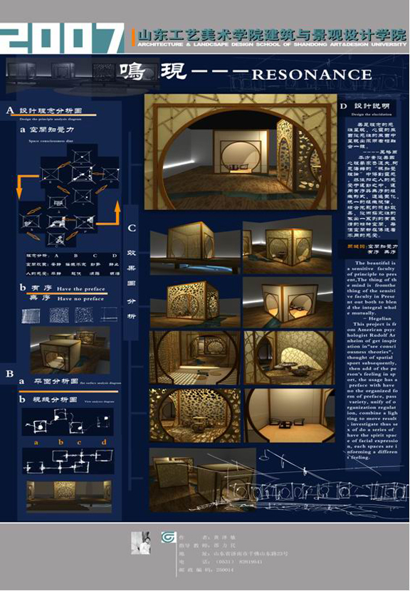 觀念性設計作品不以實用為目的,而是探索研究對未來設計的引導性,是對未來引領作用作品的嘗試,也就是說這些作品是屬于實驗性的作品。在本次展覽中,作品《鳴現——resonance》是通過光影的變化來表現心理產生的影響。此外,邵院長還提到在觀念性的作品中《澤的故事——鴛鴦廳的設計》,它把古典符號用現代材質來表現,拿現代的審美意境來做過去的主題,反映了另一種風格的美。學生這種把現代設計的營養元素重新解釋的做法也能給人以思索。