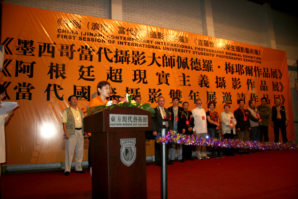 9月26日,由我校、中國攝影學會、中共濟南市委宣傳部聯合主辦的“中國(濟南)當代國際攝影雙年展”暨“首屆世界大學生攝影藝術展”的重要活動之一——“當代國際攝影大師作品邀請展”在山東東方現代藝術館開幕。副院長李新主持開幕式。中國藝術攝影學會會長劉雷為開幕式致詞。美國聯系新聞圖片社總裁羅伯特?普雷基、無國界攝影組織副主席比利奧?尼克爾、墨西哥攝影委員會主席佩德羅?梅耶爾、著名旅美攝影家李振盛以及來自美國、意大利、阿根廷、韓國、日本及中國臺灣、香港、澳門等國家和地區的著名攝影大師出席開幕式。中國藝術攝影學會會長劉雷、美國聯系新聞圖片社總裁羅伯特?普雷基、無國界攝影組織副主席比利奧?尼克爾、阿根廷布宜諾斯攝影協會主席尼科拉斯、意大利著名攝影家里諾?吉多尼等嘉賓為開幕式剪彩。
