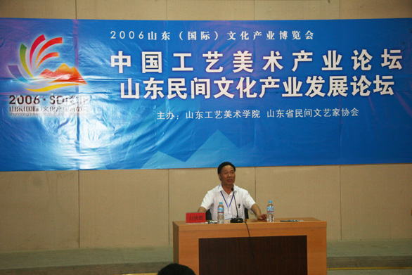 6月16日下午,2006山東國際文化產業博覽會主要內容之一,中國工藝美術產業論壇暨山東民間文化產業發展論壇在我校學術報告廳拉開帷幕,中央民族大學博士、日本筑波大學博士、北京師范大學博士后、中國民間文藝家協會分黨組書記、常務副主席白庚勝,中央美術學院設計學院副院長許平應邀主講。山東省文聯副主席、山東省民間文藝家協會主席李傳瑞,山東省民間文藝家協會副主席王映雪,我校領導