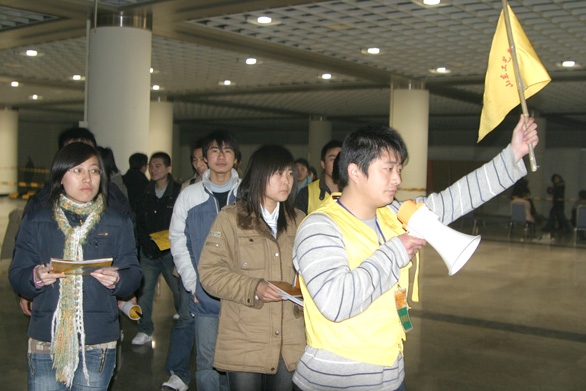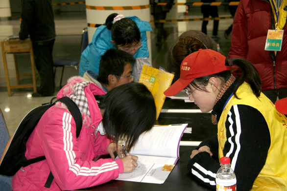 點名組負責人張冰向記者詳細介紹了志愿者組的情況。她談到:志愿者組的同學分布在會展中心大廳的一、二層,主要是接洽引導組同學的工作,將考生從自由區帶入點名區等候報名。為了不滯留考生,他們還在相應的收款、報名處設置了隔離帶,使考生能夠快速地完成報名。