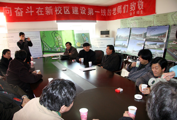 在新校區建設指揮部,王秀存副院長、刁在祥副院長與各位專家進行了座談,介紹了長清校區建設情況,并講解了長清校區整體規劃設計模型,各位專家充分肯定了我院長清校區的建設。