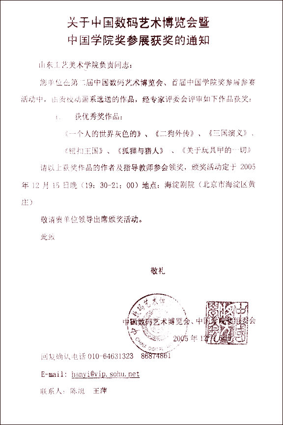在第二屆中國數(shù)碼藝術(shù)博覽會、首屆中國學院獎參展參賽活動中,我院數(shù)字藝術(shù)系動畫教研室報送的作品更是大展風采,有多件學生作品榮獲優(yōu)秀獎。分別是:《一個人的世界灰色的》、《二狗外傳》、《三國演義》、《鈕扣王國》、《狐貍與獵人》、《關(guān)于玩具甲的一切》。