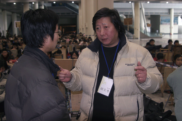副主考岐周說:“今年監(jiān)考環(huán)境與往年有所不同,采用了大場面,互通式監(jiān)考,便于管理。大空間,通透性強,不論從哪個方向都可以監(jiān)視整個考區(qū),排除了“死角”問題。同時還便于監(jiān)考人員大面積掃描考場內(nèi)出現(xiàn)的作弊現(xiàn)象。參與招生工作的學(xué)生工作人員比往年都多,他們做了大量工作。”同時,岐周還談到,相當(dāng)一部分考生懷有作弊心理,要防止、杜絕作弊現(xiàn)象的發(fā)生,關(guān)鍵是監(jiān)考人員要盡職盡責(zé)。今年我們學(xué)院在這一方面做得很好,建議以后在考試現(xiàn)場增加與考試相關(guān)的專業(yè)老師作為監(jiān)考人員,及時解答考生的疑問。”