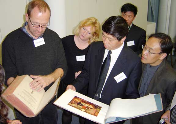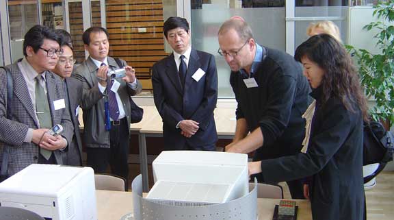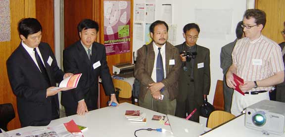 會談結束后,比勒菲爾德大學系部負責人帶領考察組織成員分別參觀了學生作業作品展覽、學生考試作品展覽,以及印刷工作室(包括電子印刷、絲網印刷等)、服裝設計(手繪表現)工作室、服裝CAD工作室、服裝面料工作室、油畫工作室、攝影工作室、媒體設計工作室、圖書館等。參觀了服裝設計專業項目教學的基本過程,當場與教師和學生進行了交流,了解項目(主題)教學的理念和方法,學生當場講述了自己通過項目教學進行學習的過程。在參觀媒體設計工作室時,Andreas Beaugrand博士以一DVD項目設計的整個過程、內容,以及涉及的學科知識為例,向考察組成員詳細介紹了項目教學的基本方法過程。