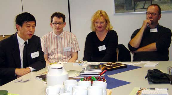 比勒菲爾德大學設計學院7名不同專業的教授與考察組成員進行了廣泛交流。他們首先介紹了比勒菲爾德大學,以及設計學院的主要專業情況。該大學共計有學生6000余人,分布于比勒菲爾德大學7個教學區。設計學院有學生約650人,有平面設計、服裝設計和攝影與媒體設計三個專業。學制四年,畢業授予碩士學位。學分制教學,每個學生必須完成注冊專業規定的5-10門必修課程,畢業論文主題必須與所注冊專業相關,否則不予畢業。選修課程則不受注冊專業限制,完全根據自己的興趣、愛好和專業需求,自己制定課程計劃進行課程選擇。理論課和文化課在教學中占有重要位置,包括藝術史、文化史、社會科學等內容。專業理論強調知識、設計形式以及設計功能等方面的研究。以杯子設計為例,其理論包括杯子的歷史、杯子的發展趨勢、杯子的造型演變、杯子的發展趨勢、杯子與生活方式,為杯子設計的創新與實踐打下基礎。在教學中,注重項目教學的作用與實施。除了專業基礎課程外,專業課程圍繞項目教學進行。以媒體設計教學為例,一個主題的DVD光盤設計包括:界面設計、說明書設計、封面設計、包裝設計等,界面設計是重點,課題的完成設計藝術、文化、科學技術等多種專業知識。考試方式一般是:學生與上課教師預約—教師同意考試—學生完成考試—學生對自己設計進行公開展示接受公眾評判—教師評定。