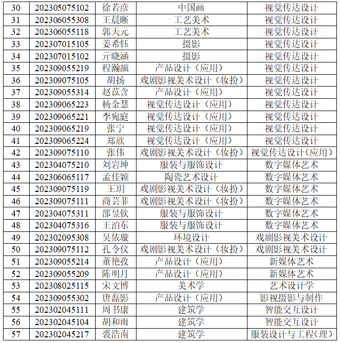 根據《歡迎來到公海7108線路關于全日制本科生轉專業的辦法》(魯工美院辦字【2014】22號)規定,學校組織了2023級本科128名學生轉專業報名和考試工作。根據規定,普通理科專業錄取辦法按平均學分績點排名,由高到低排名擇優錄取;藝術類專業按考試成績合格后,成績由高到低排名擇優錄取。經考核,同意李夢雨等57名同學擬轉入申請專業學習。為體現轉專業工作的公開、公平、公正性,現將結果公示如下: