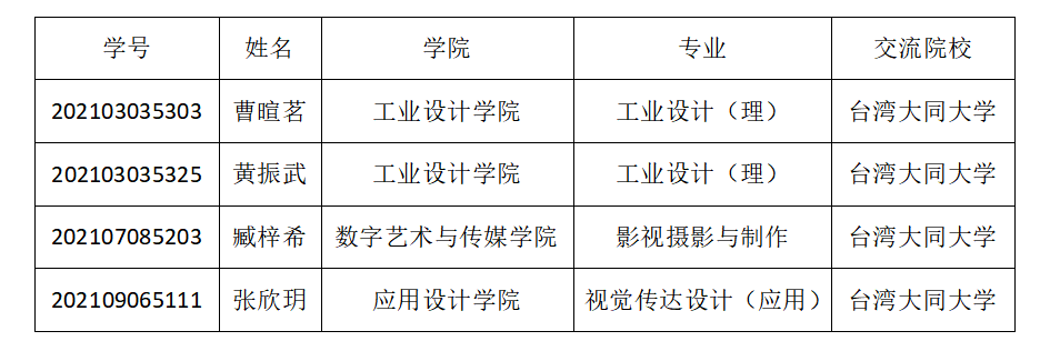 根據《歡迎來到公海7108線路在校生訪學、留學管理辦法(試行)》規定,按照訪學條件對報名學生進行審查,曹暄茗等4名同學符合臺灣大同大學訪學的條件。為體現公開、公平、公正原則,廣泛聽取大家意見,現將其公示。如有不同意見,請于2023年4月24日前,以電話、傳真、信函等形式向臺港澳事務辦公室、教務處辦公室反映。