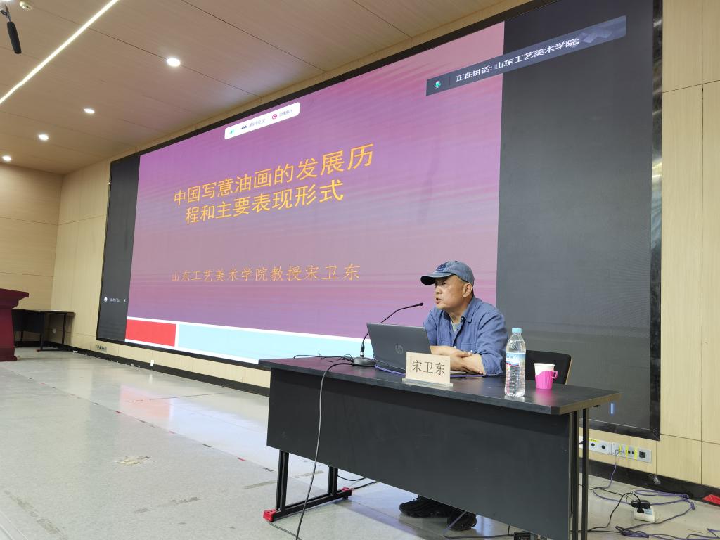 4月17日,宋衛(wèi)東教授于長清校區(qū)階梯一教室為學校師生做《中國寫意油畫的發(fā)展歷程和主要表現(xiàn)形式》講座,教務處處長顧群業(yè)主持講座并致開場辭,學校師生通過線下線上結(jié)合的方式聽取了講座。