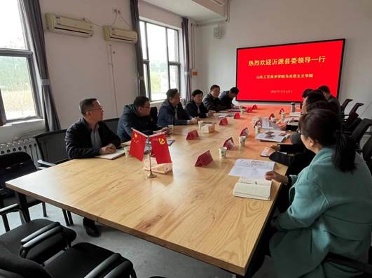 張文代表沂源縣委對我院選派掛職教師孫傳輝在派駐沂源工作隊期間所做的貢獻表示感謝,并簡要介紹了沂源縣當地特色和經濟社會發展總體情況。他表示,沂源縣作為沂蒙革命老區之一、山東省三線建設的主陣地、長津湖戰斗英雄朱彥夫的家鄉,蘊含著豐厚的紅色革命教育資源和豐富的思想政治教育素材。淄博市618電臺、朱彥夫教育基地、李振華事跡展廳等教育場館都書寫著眾多感人肺腑的人間奇跡,弘揚著可歌可泣的革命精神。他希望,下一步校地雙方在大學生思想政治教育基地建設、景區文創產品設計研發、沂源礦泉水品牌設計推介等方面能加大交流與合作,實現互惠共贏。