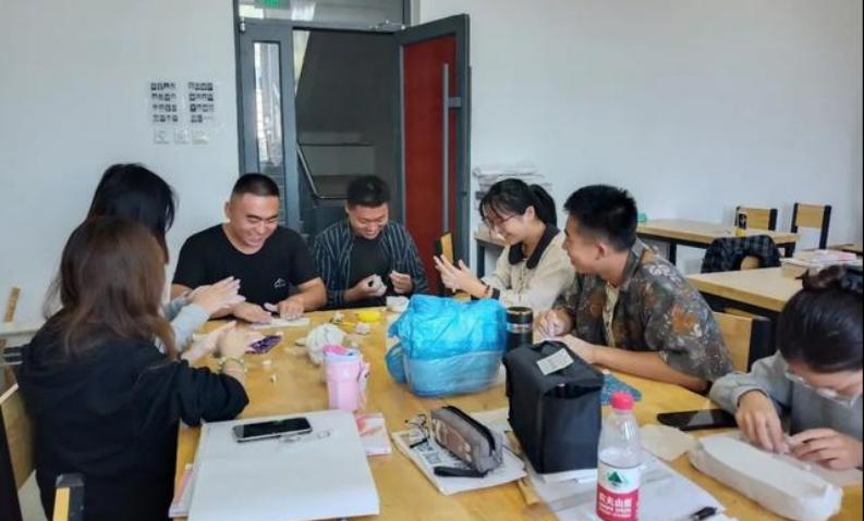 在理論學習的基礎上,青年從業者和學生共同開啟了第一次陶瓷實踐課。這是22級雕刻專業的學生們第一次接觸泥料,從業者們結合各自實踐經驗,從泥料的特性、造型要點和技巧等方面悉心指導學生進行陶瓷作品創作,并進行現場演示。學生們認真學習實踐,與從業者互動交流,完成自己創作的陶藝作品。
