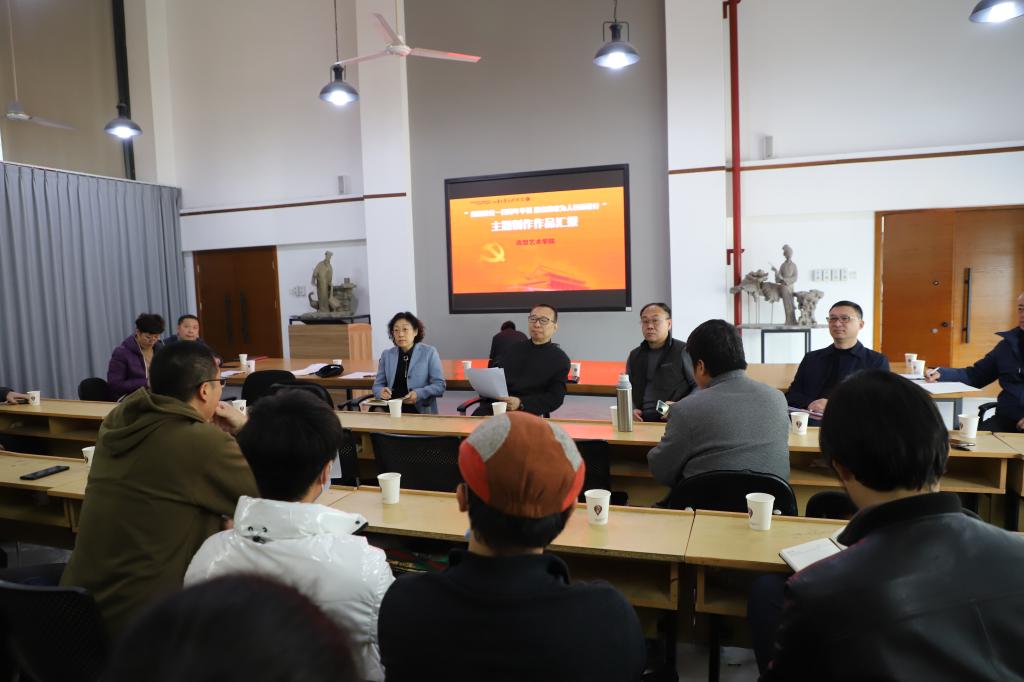 相關教學單位匯報主題創(chuàng)作情況,潘魯生聽取匯報并觀摹指導草圖創(chuàng)作。潘魯生表示,從創(chuàng)作情況看,各教學單位精心組織,廣泛動員,作品主題明確,題材豐富,體裁多樣,藝術語言具有創(chuàng)新性,專業(yè)特色鮮明,主題創(chuàng)作取得了積極成效。