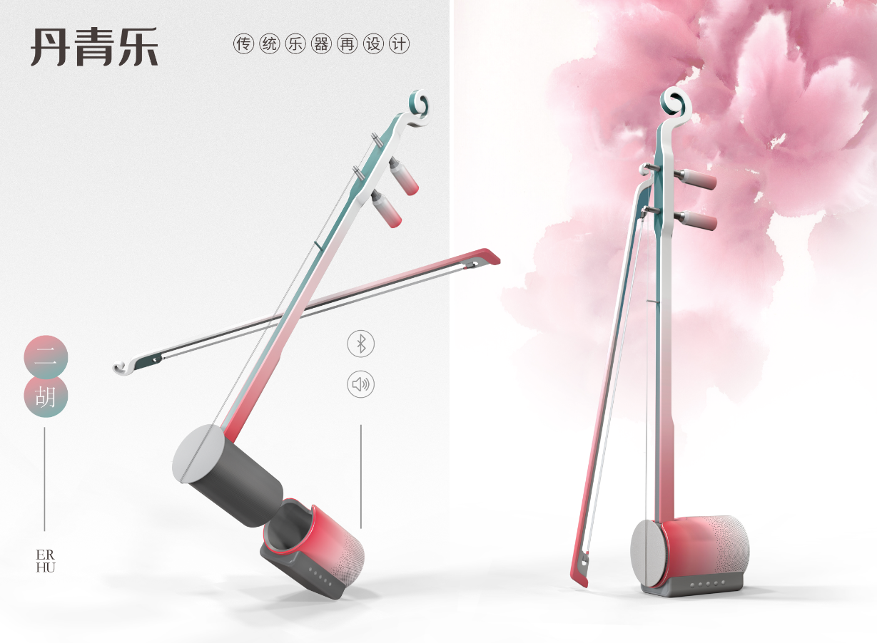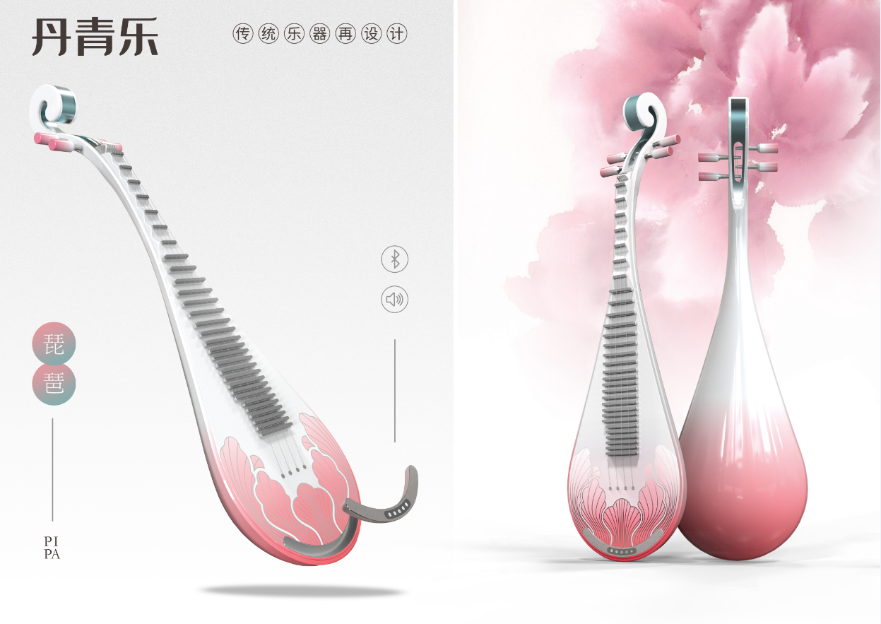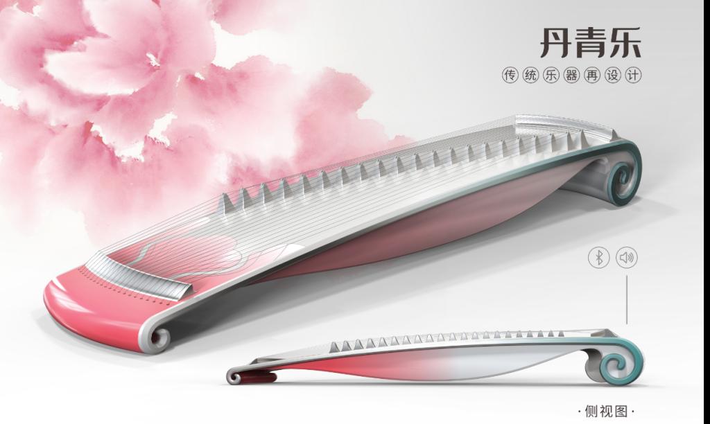 設計團隊在潘魯生的指導下,立足當地產業,突出當地“牡丹”品牌,對古琴、古箏、笙、琵琶、阮琴、二胡等傳統樂器進行再設計。再設計的樂器,在延續傳統泡桐材質與加工方式的基礎上,在產品中嵌入藍牙音響等錄音播放設備,產品局部融入牡丹元素,突出地域文化特征,并從牡丹中提取色彩要素,呈現出潔凈鮮明,簡潔時尚的視覺特征。