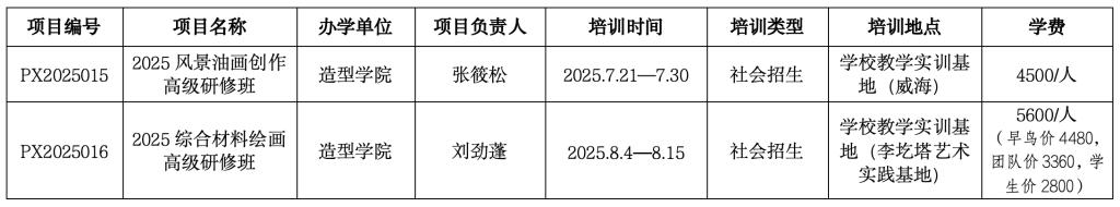 根據教育部《普通高等學校舉辦非學歷教育管理規定(試行)》(教職成廳函〔2021〕23號)及《歡迎來到公海7108線路非學歷教育管理辦法(試行)》(魯工美院辦字〔2024〕7 號)等文件要求,造型學院申報的“2025風景油畫創作高級研修班”、“2025綜合材料繪畫高級研修班”2個非學歷教育培訓班經所在單位論證,主管部門審核,校領導審批,予以立項舉辦。現將信息公示如下: